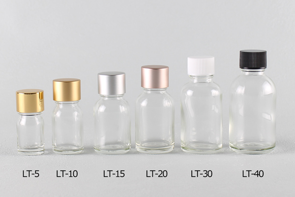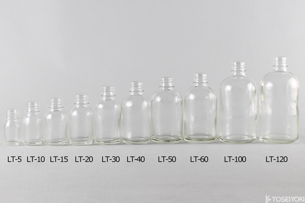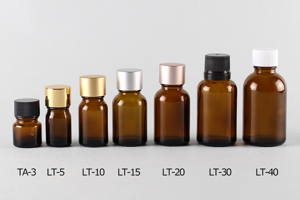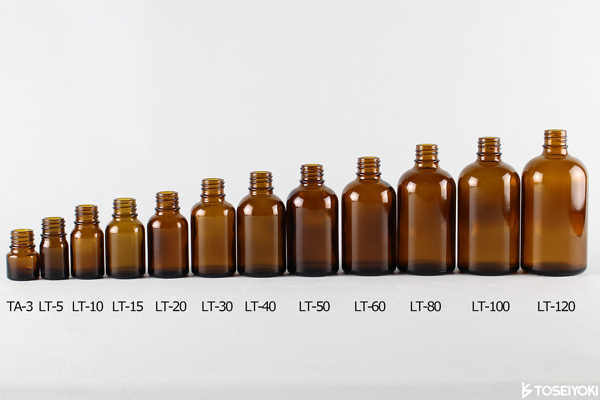 容量は3mL 5mL 10mL 15mL 20mL 30mL 40mL 50mL 60mL 80mL 100mL 120mL、茶色遮光瓶と透明瓶がございます。表面をマットにするフロスト瓶も1ケースから承ります。