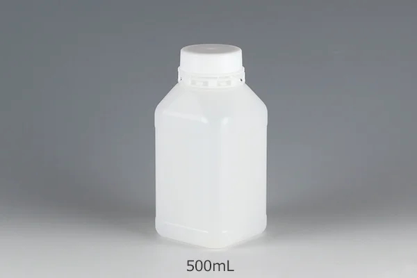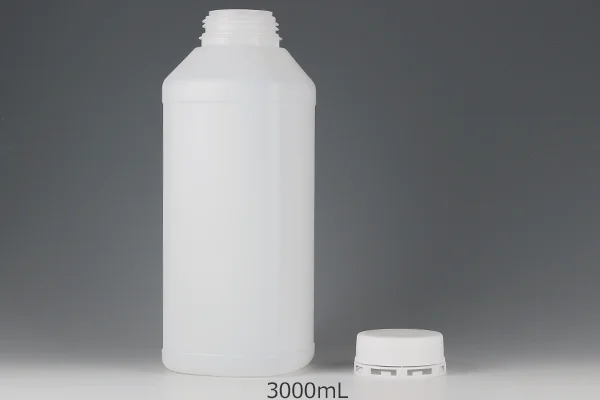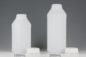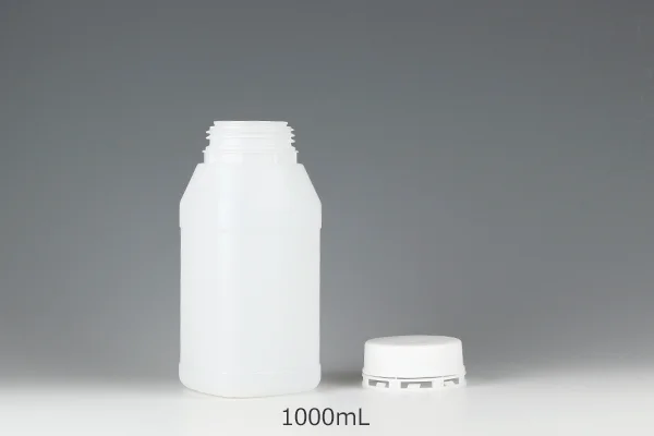 目盛りとセキュリティ機能がついた封印キャップがついた1リットル容器です。ボトルは耐薬品性に優れたHDPE(高密度ポリエチレン)を使用しています。ボトルの側面には目盛が刻印されており、使用量や残量がひと目で分かり大変便利です。